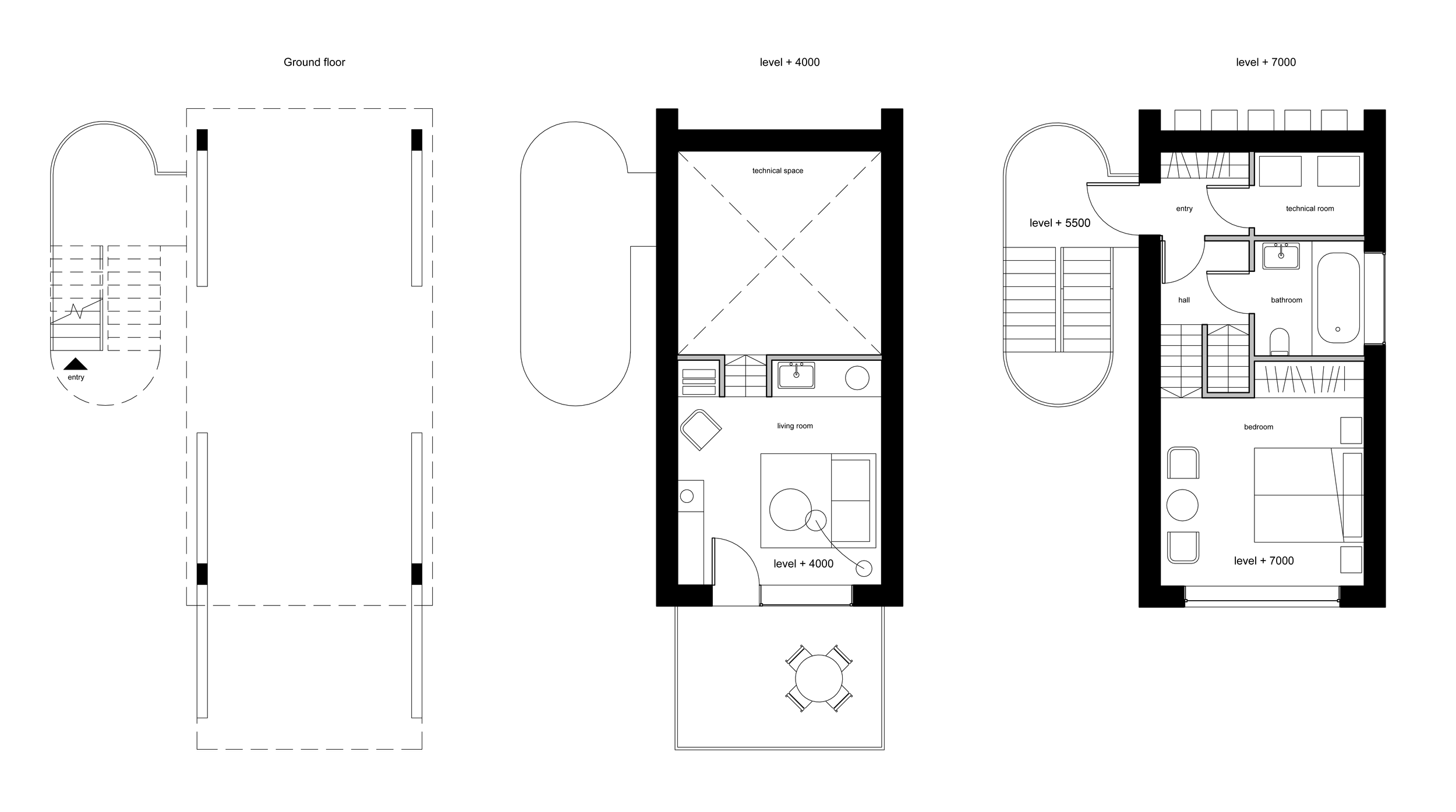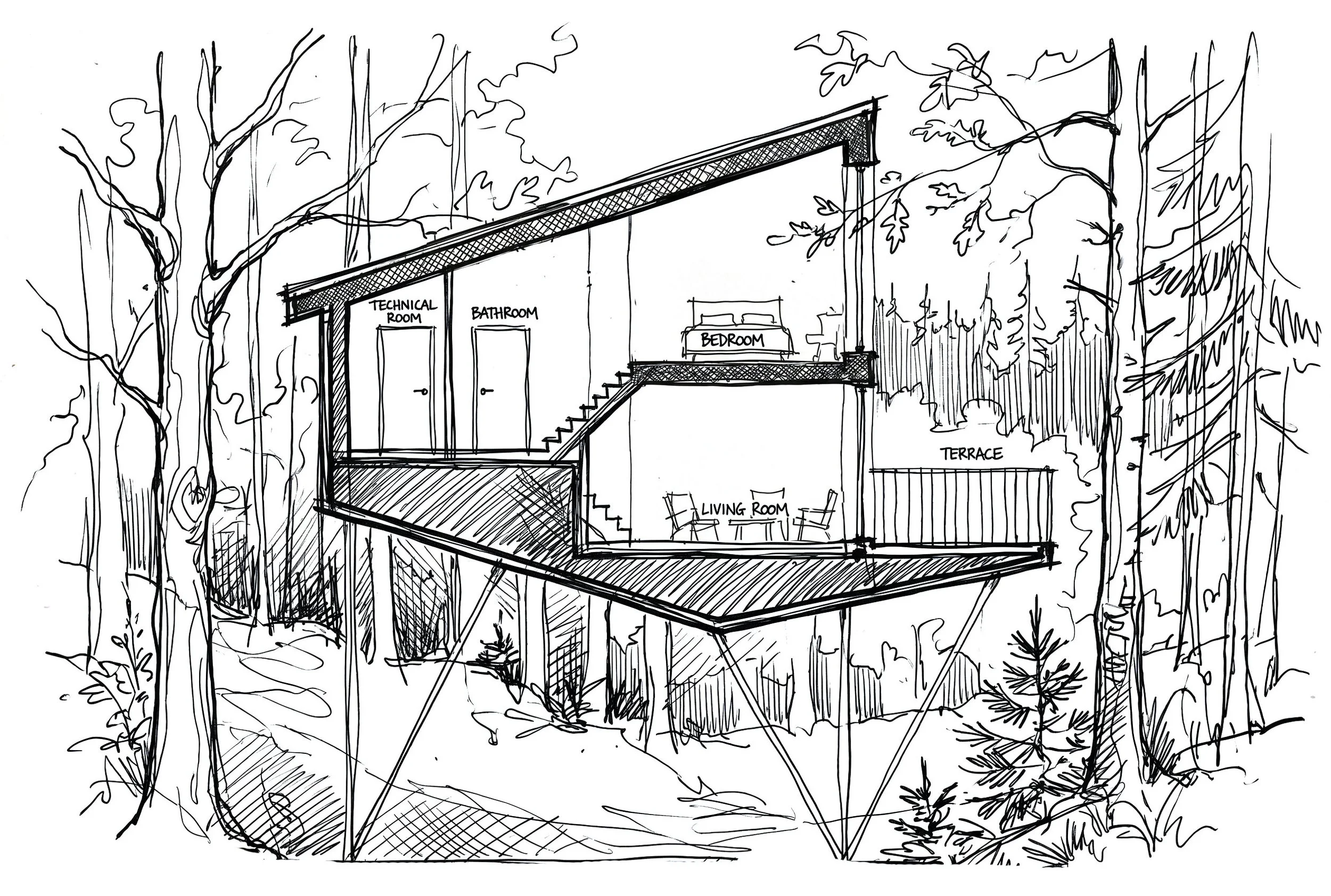 On the lower level, the living room flows directly onto a large terrace — a perfect spot for morning coffee surrounded by trees. The upper level offers comfortable bedroom with panoramic window. The layout is thoughtfully compact and highly functional.