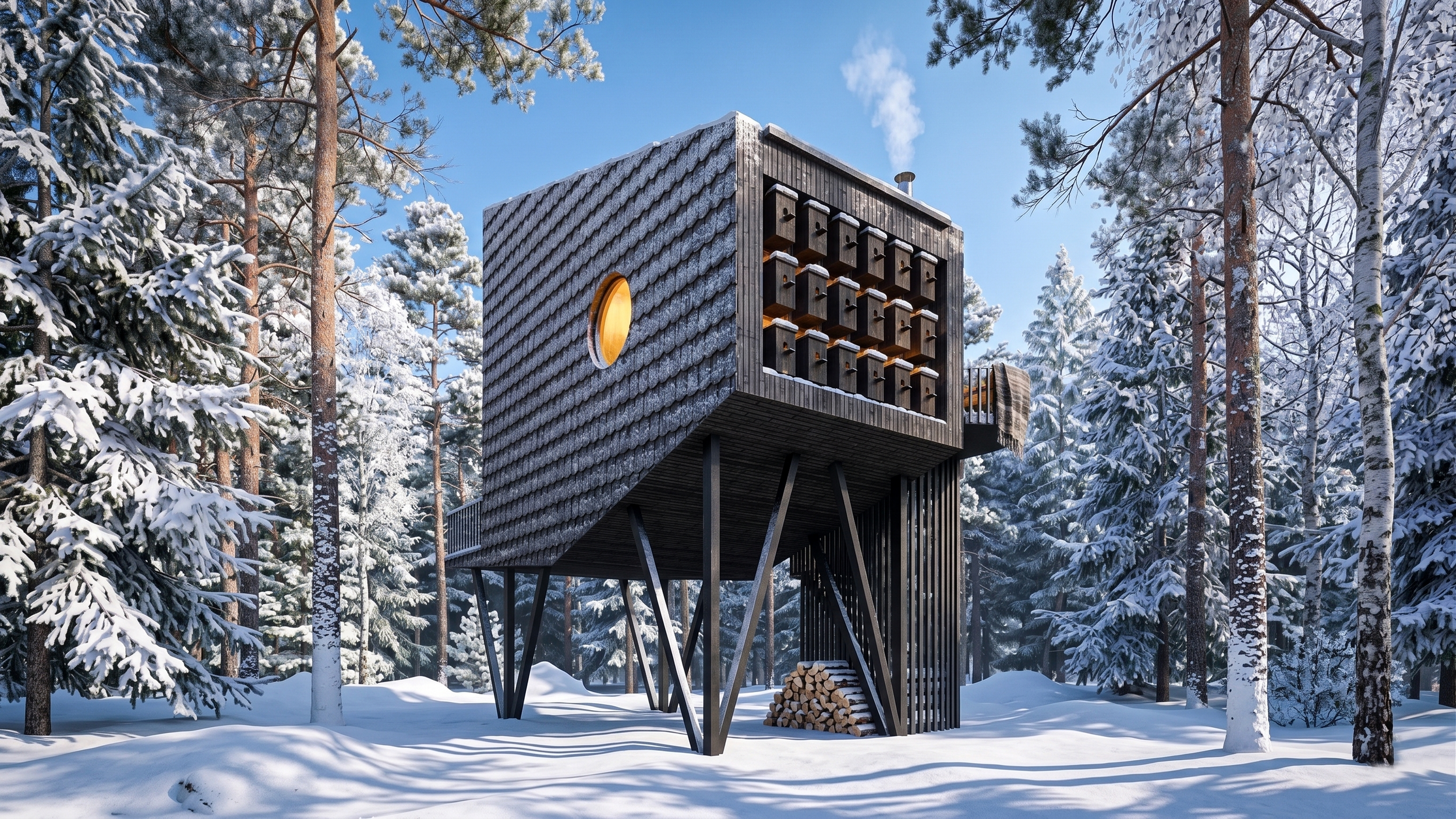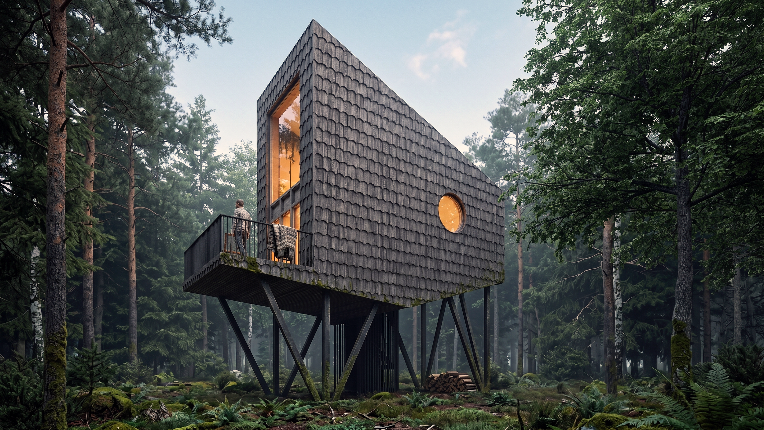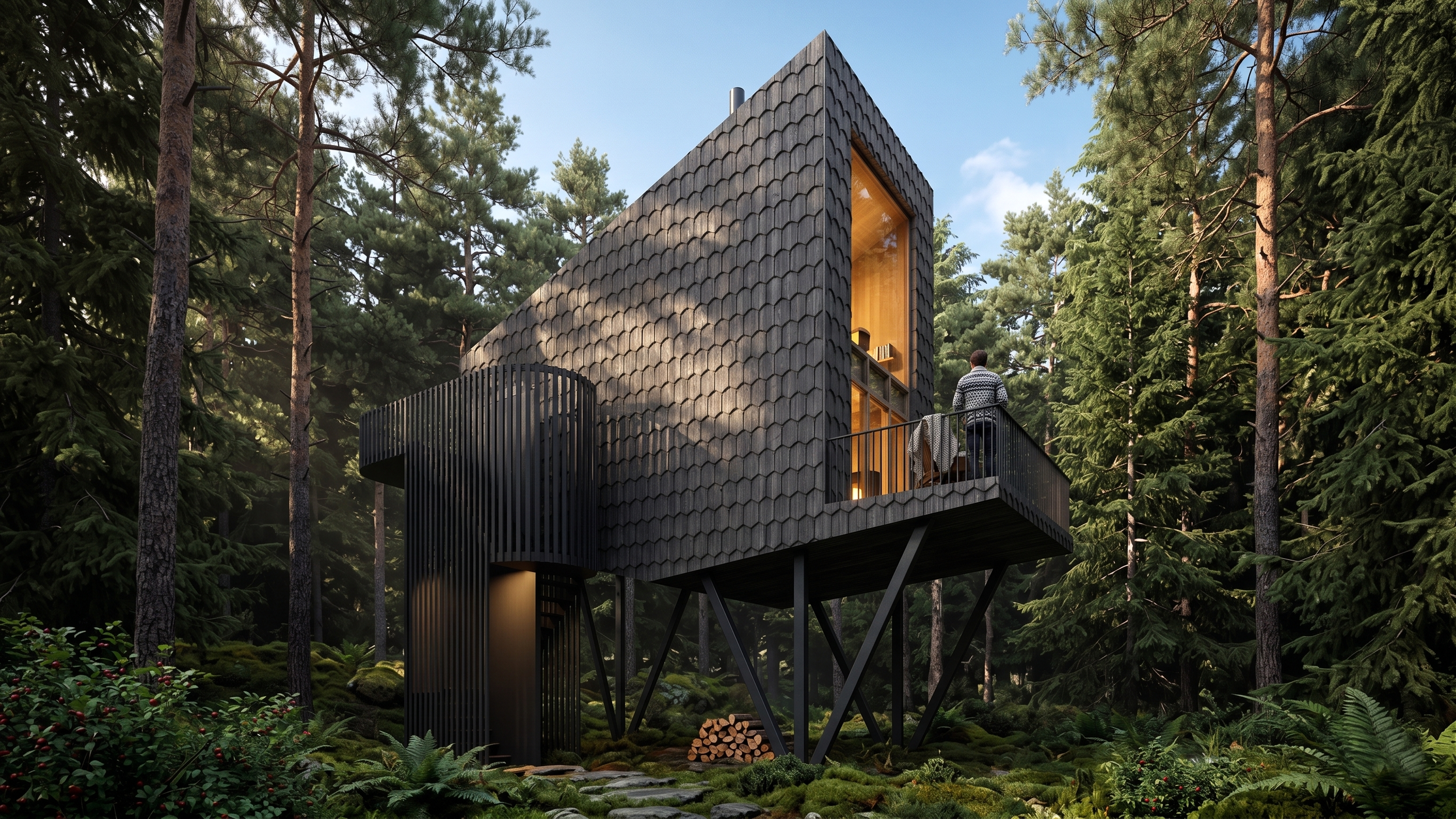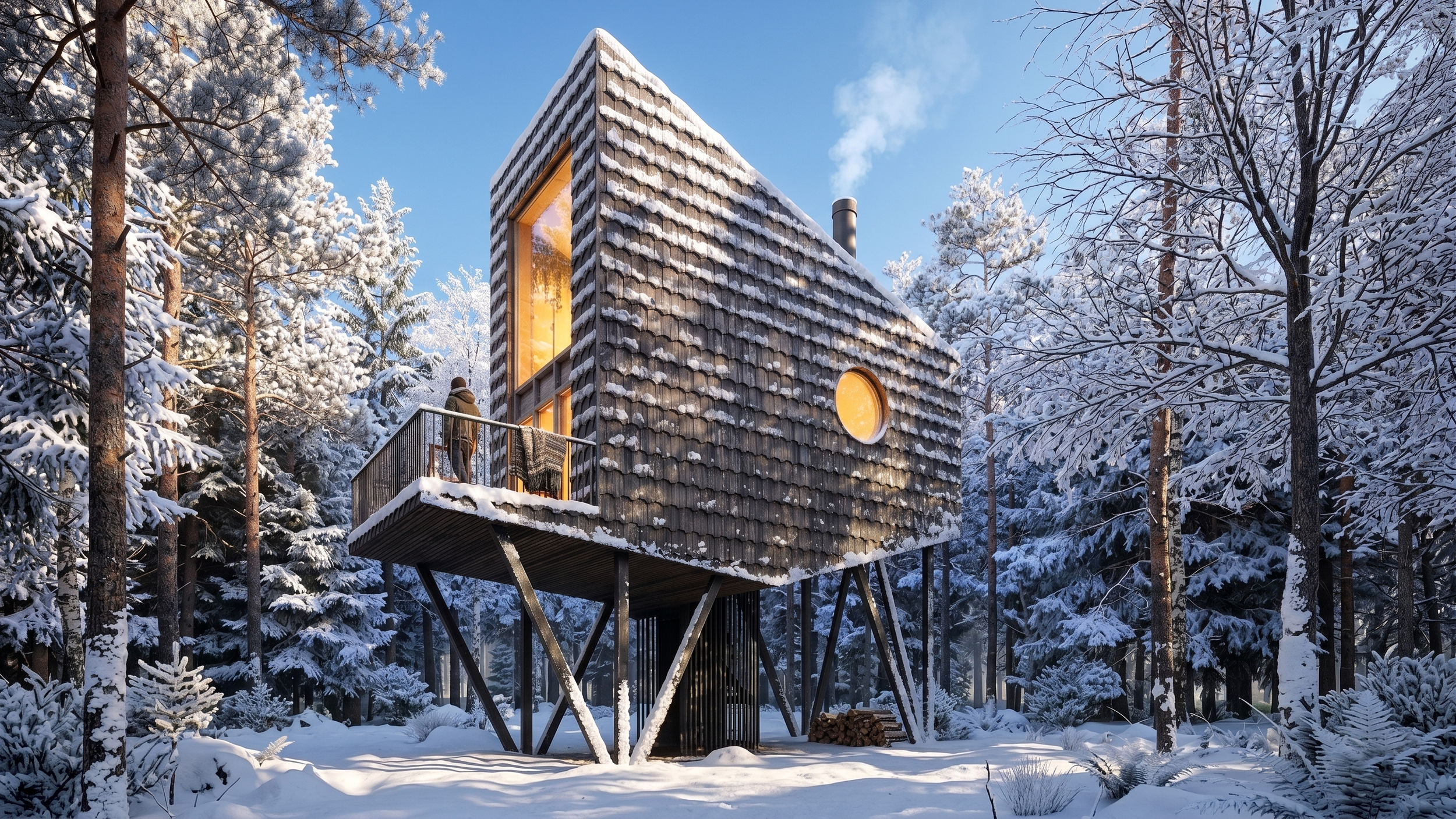 The house is built almost entirely from local, sustainable wood. The façades are clad in hand-crafted shingle (traditional wooden scales), executed using authentic local techniques. This textured “feathered” skin not only protects the building from harsh weather but also poetically references the plumage of the forest birds that inhabit the area.