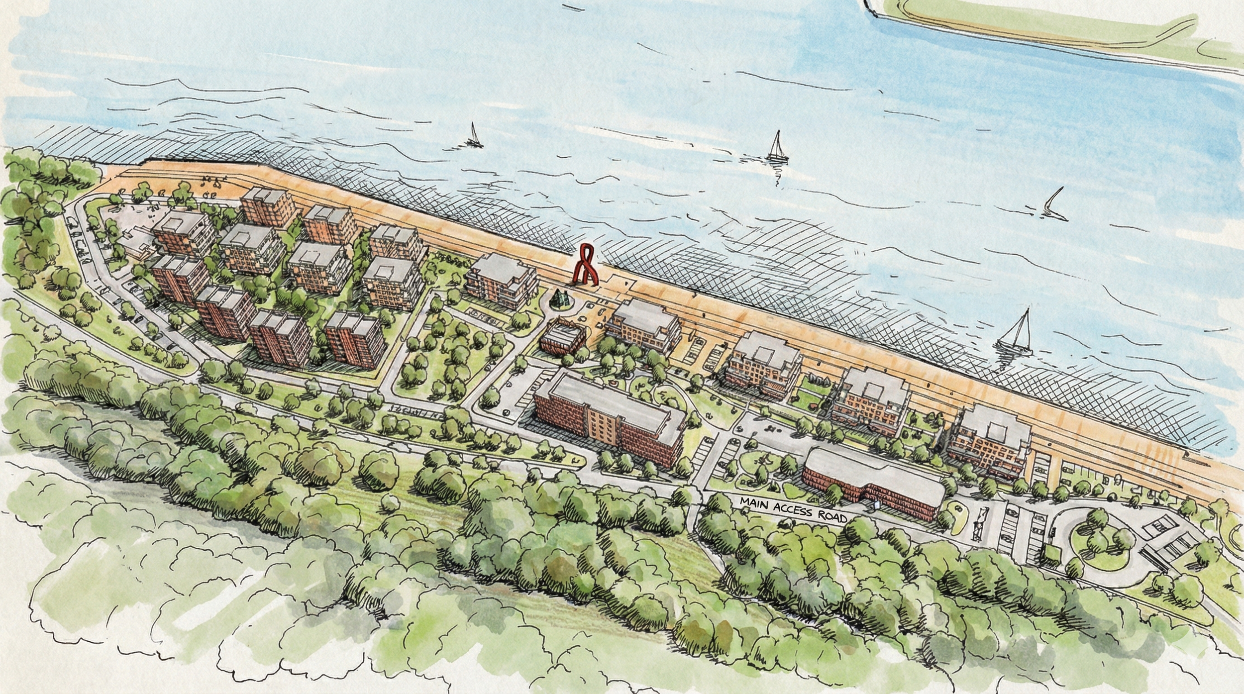 The Promenade: A continuous waterfront boulevard featuring art sculptures, retail frontage, and "pocket parks" that serve as the development's social artery.