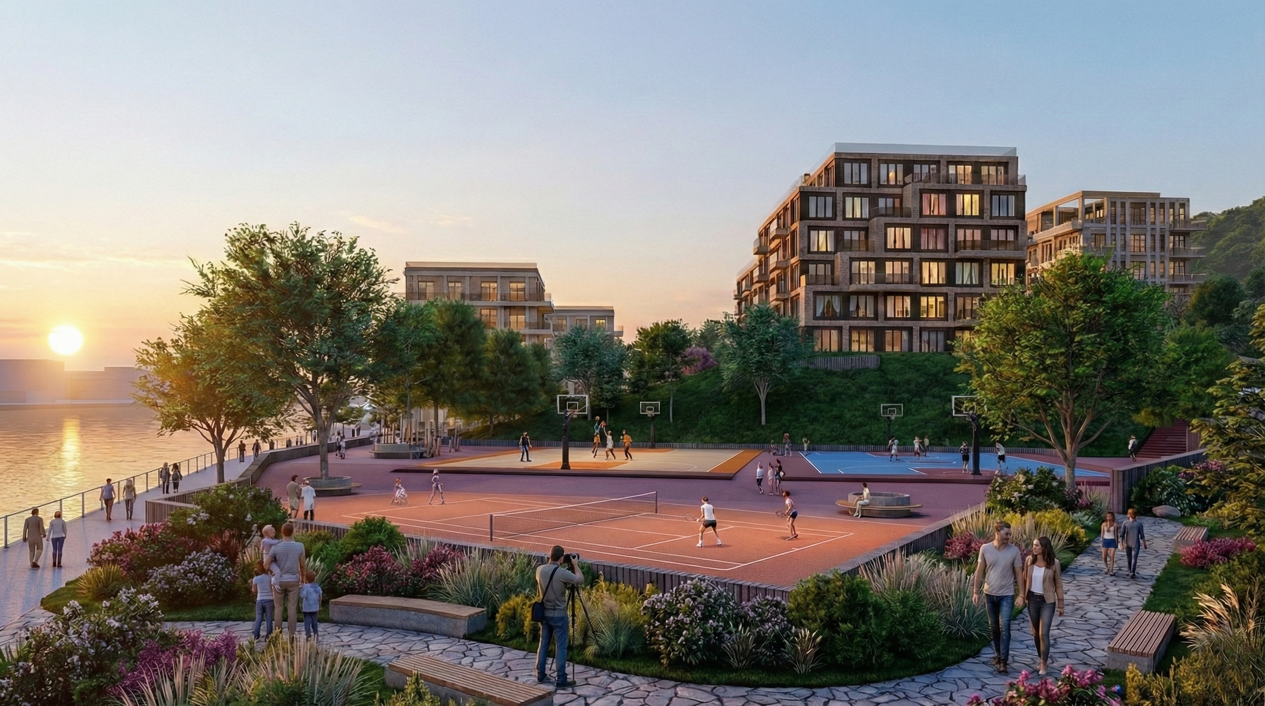Designed for a holistic lifestyle, the Sluda project integrates essential amenities directly into the landscape. The plan includes a Sports Park with tennis and basketball facilities, a 900 m² children's Play Hub, and educational facilities (kindergarten/school) situated at the prime first line.