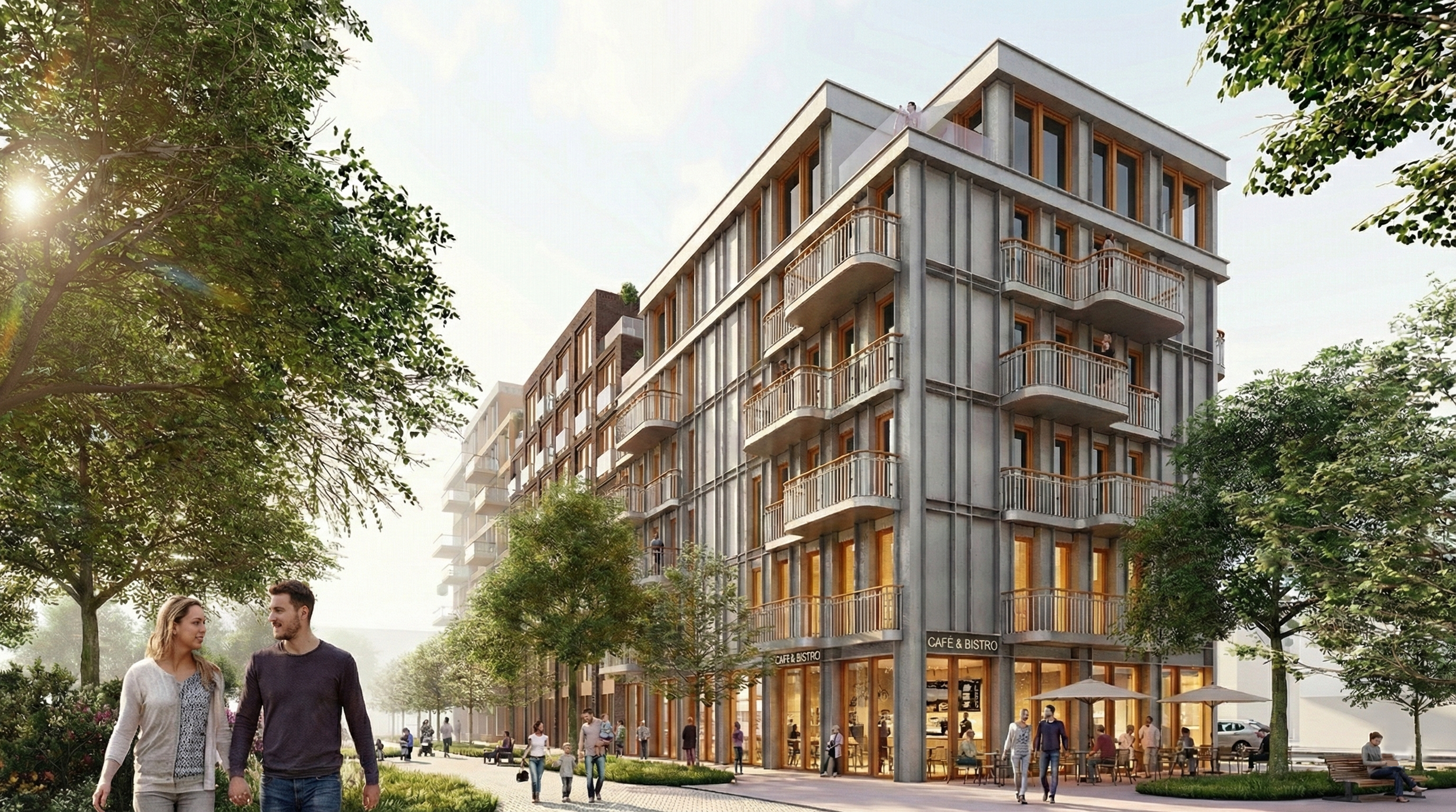 The master plan creates a simple yet elegant development, restoring street front continuity and opening breathtaking visual connections to the lush green zone. The linear building volume establishes a clear yet welcoming park boundary, turning a forgotten "backyard" into a dynamic urban facade. At ground level, cozy cafés, restaurants, and terraces bloom, enlivening the park edge and inviting not only complex residents but also neighbors from nearby neighborhoods to enjoy the atmosphere of unity with nature.